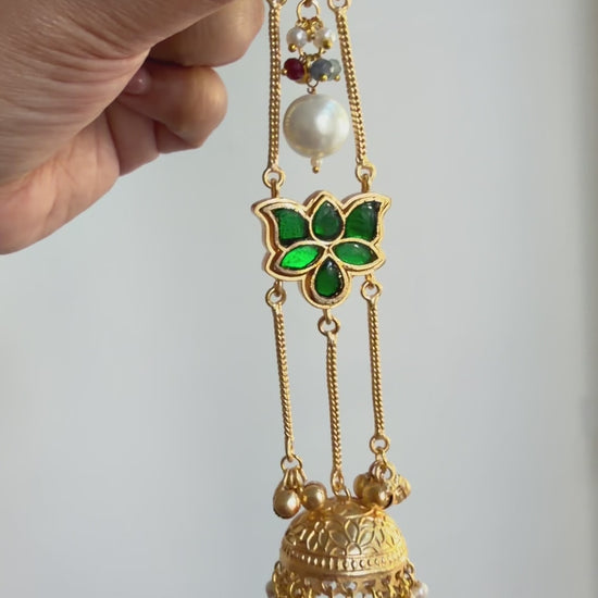 Features: Green enamel butterfly motif, teardrop natural stone top, dual jhumka domes, pearl bead clusters, multicolored semi-precious accents